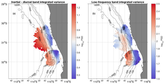 Spatial distribution of band-integrated current variance for (a) diurnal-inertial, corresponding to periods in the range [21 h 44 m 20.8 s, 26 h 18 m 56.8 s]; and, (b) low-frequency (periods longer than 4 days). Note the discontinuity along the 200 m isobath, separating the shelf break and the deep-water regions. Units for band-integrated variance is log10 (m2s−2cph−1).