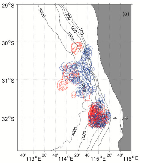 The LC is associated with an energetic meso-scale eddy field with maximum eddy diameters > 200 km. However, the HFR coverage was limited to examining the sub-mesoscale (eddies with diameter < 50 km). The automated eddy identification method revealed ~300 eddies with at least 1-day persistence over the period 2015–2017. There was a prevalence of counterclockwise-rotating (CCW, 177 cases) over clockwise-rotating eddies (CW, 120 cases). Eddies appeared to persist at the same location for extended periods, with typical drift distance of ~10 km around their center; however, in some cases they were advected with the mean flow and travelled in a southwards direction with speeds up to 8 km/day. Their occurrence was limited to deeper water; offshore 200 m depth contour (Figure 12a). There were two main regions for the aggregation of eddies (Figure 12a): (1) between latitudes 30° S and 31.5° S where larger (50–60 km diameter; Figure 12b), CCW eddies were prevalent. Here, the eddies were spread over a wider region; and, (2) offshore the Rottnest island, associated with the Perth canyon (Figure 2), where both isolated or paired CW and CCW eddies were observed. The Perth canyon region was where the most persistent eddies were found concentrated in a smaller region. This is most likely due to the topographic effect of the canyon and the horizontal shear associated with the LC and the CC.