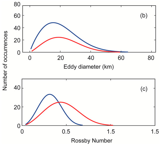 Overall, there were 50% more CCW eddies compared to CW with eddies with diameter 15–25 km being the most prevalent (Figure 12b). Maximum eddy diameters were up to 60 km. The Rossby numbers (Ro) were up to 1.5 (mean value Ro = 0.46) for CW eddies (Figure 12c), and to Ro = 0.64 for CCW eddies (mean value: Ro = 0.32).
