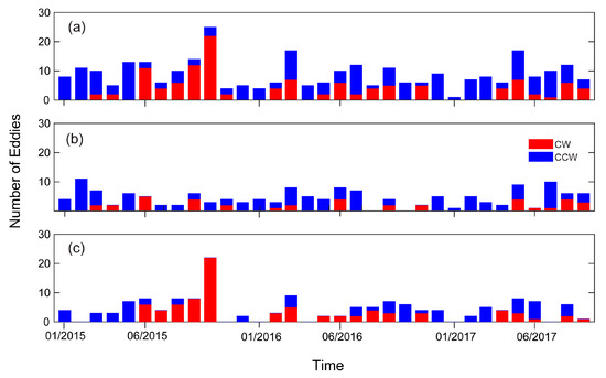 Time series of monthly number of days with eddies over the period January 2015 to September 2017: (a) total for the study region; (b) for the region north of north of 31.5° S; and (c) for the region south of 31.5° S. Blue and red bars represent counterclockwise (CCW) and clockwise (CW) eddies respectively.