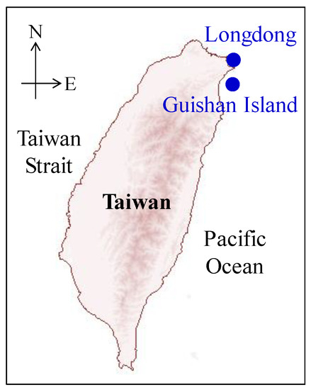 Figure 1). The Longdong Buoy, installed by the Central Weather Bureau, is near the Longdong headland. The location of the buoy is 121.923° E and 25.096° N, approximately 1 km from the coast at a water depth of roughly 23 m. The Guishan Island Buoy, installed by the Tourism Bureau, is between the east coast of Taiwan and Guishan Island, which is approximately 10 km east of Taiwan. The Guishan Island Buoy, located at 121.923° E and 24.847° N with a water depth of roughly 28 m, is approximately 1 km west of Guishan Island and 9 km east of the coast of Taiwan.