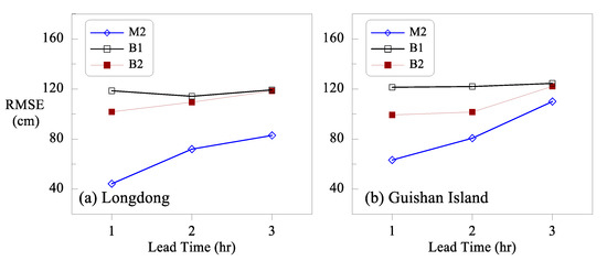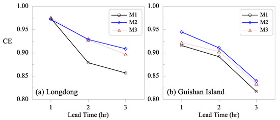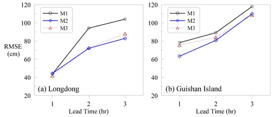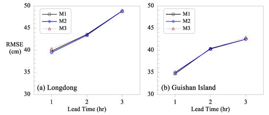 Figure 3. Overall, M1, M2, and M3 had similar performance during the calibration phase, but the calibrated models for Guishan Island had smaller errors than those for Longdong. Obviously, model performance decreases as lead time increases.