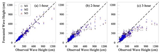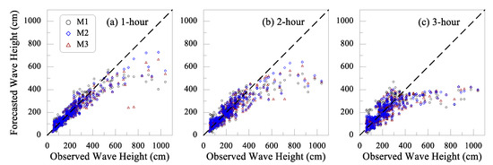 Figure 5 present scatter diagrams of the forecasting results for Longdong and Guishan Island, respectively. The forecasting results for the lead time of 1 h were satisfactory. For 2- and 3-h forecasting, the forecasts for large wave heights were obviously underestimated, especially the 3-h forecasting at Guishan Island. As for the M1, M2, and M3 models, the data of M2 and M3 are closer to the 45-degree line than those of M1, indicating that the addition of input variables can improve forecasting performance.