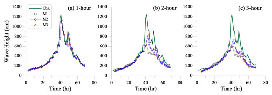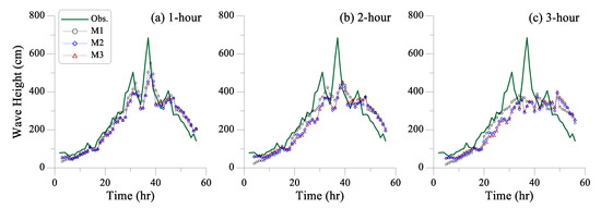 represent the forecasting models of M2 with lead times of 1, 2, and 3 h, respectively. The M2 models with local wind and air pressure information were expected to achieve better forecasting performance than the M1 models, because local meteorological variables have considerable effects on wave formation.