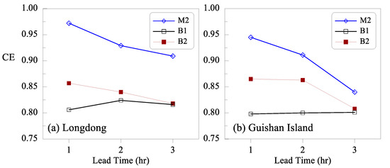 Figure 11 presents the CEs for the B1 and B2 models; the CEs are roughly 0.80 to 0.86. Overall, the two backup systems are inferior to the original systems (M1, M2, and M3) but still have acceptable forecasting ability, with wave height forecast errors of approximately 1 m during typhoons. The B2 models outperformed the B1 models, indicating that when no local wave or meteorological data are available, adding neighboring sea state information (i.e., wave height) can enhance forecasting ability. However, as the lead time increases to 3 h, this enhancement becomes less apparent.