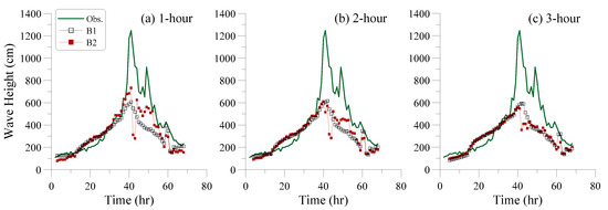 indicate the forecasting models of B1 with lead times of 1, 2, and 3 h, respectively. The second backup system, B2, adopts the wave height from the neighboring buoy station (