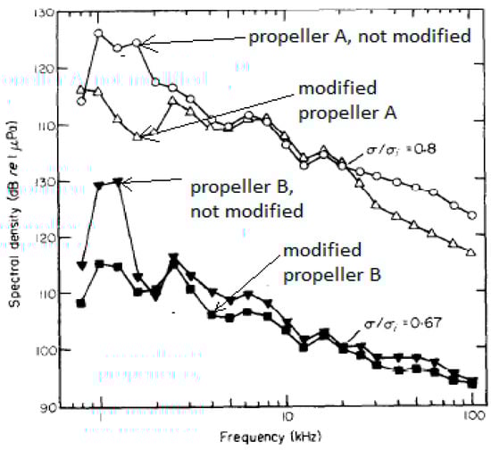 Influence of blade modification on cavitation noise for J = 0.38. Reproduced from [] with permission from Elsevier, 1990.
