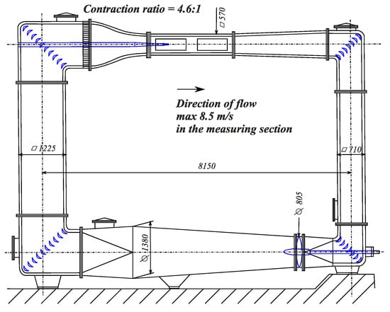 The UNIGE tunnel is a Kempf & Remmers (K&R) closed water circuit tunnel, schematically represented in Figure 9. The tunnel has a square testing section of 0.57 m × 0.57 m, having a total testing section length of 2 m. The nozzle contraction ratio is 4.6:1, allowing a maximum tunnel flow speed of 8.5 m/s in the test section. The tunnel is equipped with a K&R H39 dynamometer, which measures the propeller thrust, torque and rate of revolution.