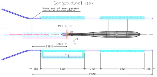 In Section 2, Figure 11 showed a schematic of the setup adopted during these tests, including the positions of three hydrophones. As shown in Figure 11, two hydrophones were mounted on fins downstream of the propeller: one on the port side at the same vertical position as the propeller shaft (H2); the other (H3) on the starboard at a lower vertical position. The third hydrophone (H1) was mounted in an external plexiglass tank filled with water and mounted on the bottom window of the test section. The measurements from H3 were used for the noise results presented throughout this paper.