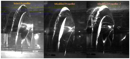 Remarks on the cavitation observation for the intact propeller, Modified Propeller and Modified Propeller-2 cases for Condition V1 and V2 are provided in Table 4. Some sample images are also shown in Figure 13 and Figure 14 for the three propellers alongside Case V1 and V2 in this respective order. From the images and the remarks in Table 4, it is evident that with the introduction of PressurePoresTM, tip vortex cavitation experienced by the intact propeller was disrupted. For the Modified propeller case, in both conditions, the tip vortex cavitation almost disappeared. For the Modified Propeller-2 case, the PressurePoresTM changed the nature of the steady, solid tip vortex cavitation to a cloudier line with less strength and reduced core diameter.