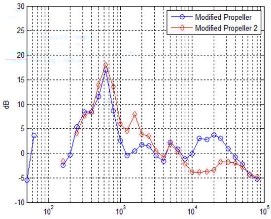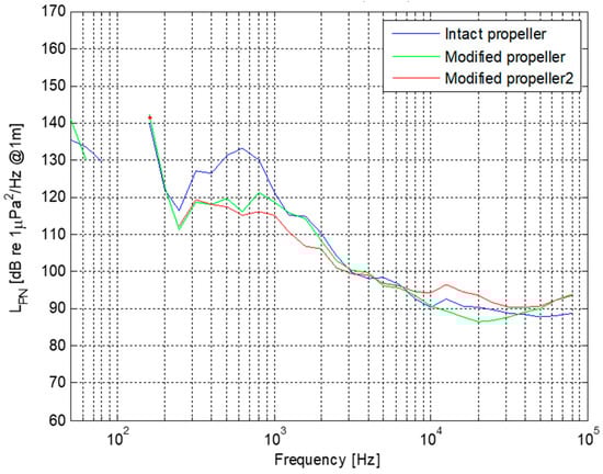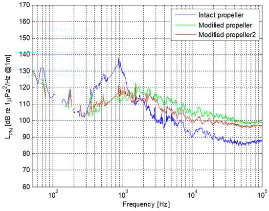 Comparative sound pressure levels of three model propellers J = 0.55 and cavitation condition. Reproduced from [] with permission from Newcastle University.