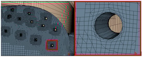 The numerical mesh is an unstructured trimmed grid, and basic prismatic cells are applied near to the blade surface for resolving the boundary layer (trying to keep y+ close to 1). MARCS was also used for local mesh refinement to be able to simulate TVC and evaluate the benefit of using the drilled holes in the presence of more realistic TVC extents. Additionally, for the tip drilled propeller, different mesh arrangements were generated around the drilled holes. Smaller mesh size for the pressure pore surfaces was used to capture the cylindrical hole shape properly as shown in Figure 22.
