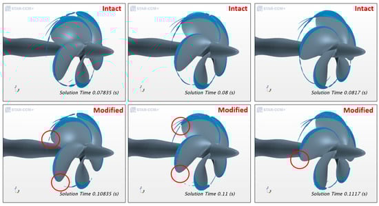 Pattern comparisons between intact and modified propellers for different blade positions. (Top row: Intact propeller, Bottom row: Modified propeller).