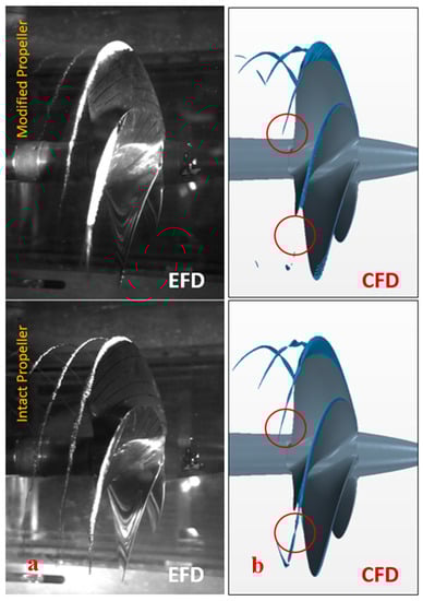 Comparison between (a) EFD (Left) and (b) CFD (Right) for intact and modified propellers.