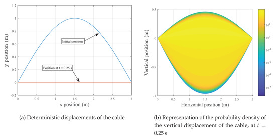 There are six variables influencing the results of Equation (20)—A, L, x, T, m1, and t—of which only two are subjected to uncertainty: T and m1. For the reference deterministic case, against which we will compare the results of uncertainty quantification, we choose for the variables the values presented in Table 1. The reference values for L, T, and m1 were selected so that the cable would have an oscillation period of 1 s and that at odd multiples of 0.25 s it would be on a perfectly straight line, as illustrated in Figure 2a. For simplicity, we assign uniform distributions to T and ml: , .