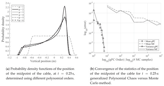 We use this simple case to illustrate the convergence of the gPC mooring cable surrogate model. Figure 3a illustrates how the PDF of position evolves as p is increased, for the midpoint of the cable (x = 1.5). For p = 1 we obtain a quite crude PDF, but for p = 2, the approximation is reasonable. A polynomial order p = 3 has practically converged to the final PDF. For polynomial p > 4 it is almost impossible to tell the plots apart, and so the PDF has converged. We find that the expected value of the position of the midpoint of the cable, computed using gPC, is 9.39 × 10−2 m, and the variance is 1.26 × 10−1 m2.