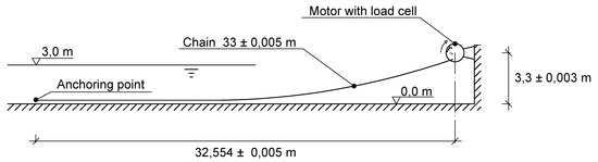 In this case we analyze the influence of uncertainty in the hydrodynamic coefficients of a mooring cable (added mass coefficient, Cm, normal drag coefficient, Cdn, and tangential drag coefficient, Cdt) on the tension at its upper end. The simulations reproduce experiments reported by Lindahl [38], whose data is available through ref. [39]. The experimental set-up is illustrated in Figure 4. It is composed of a submerged chain, with one end anchored to the bottom of a concrete tank and the other attached to a disk slightly above the water. The disk moves the top end of the chain in a circular motion, with a radius rm = 0.20 m, for two different periods: Tr = 1.25 s and Tr = 3.50 s. A summary of the relevant properties of the cable and of the numerical model is presented in Table 2. The cable was discretised using Nel = 10 elements of order p = 5, with a limitation on the time-stepping that the Courant–Friedrichs–Lewy value should not exceed 0.45.