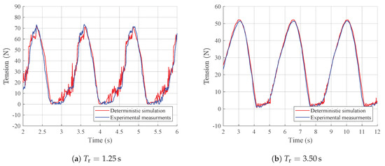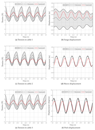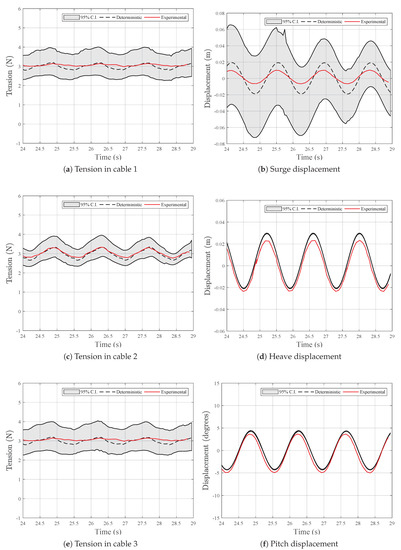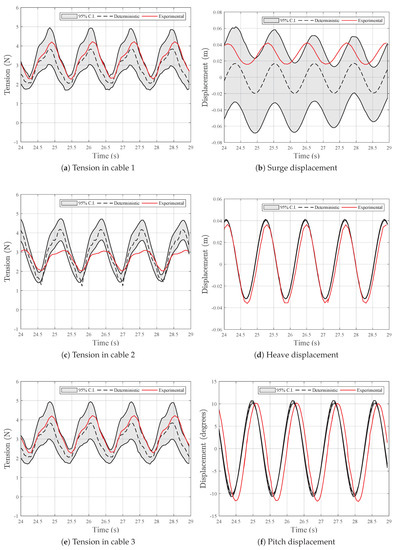 Before analyzing the results of the gPC model we note that there are differences between the physical model results and the deterministic simulations, already analyzed in [25,33]. The main cause for the difference between the mean surge displacement in the simulations and the one measured in the experiments is the WEC-Sim simulations not accounting for second order drift forces. As the mean surge displacement and the tension in the cables are linked, more accurate results in the simulation of surge, such as for , lead to more accurate results in tension.