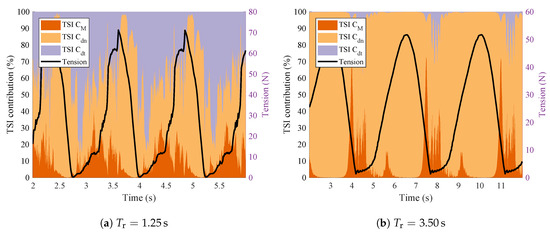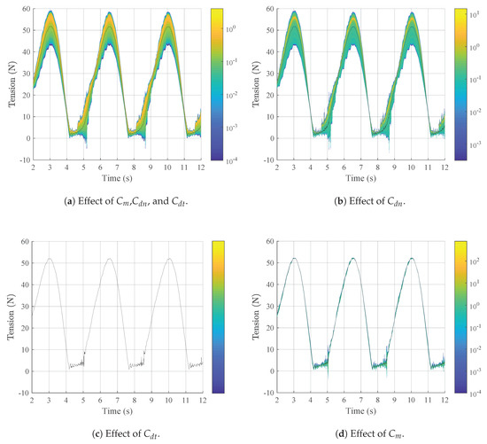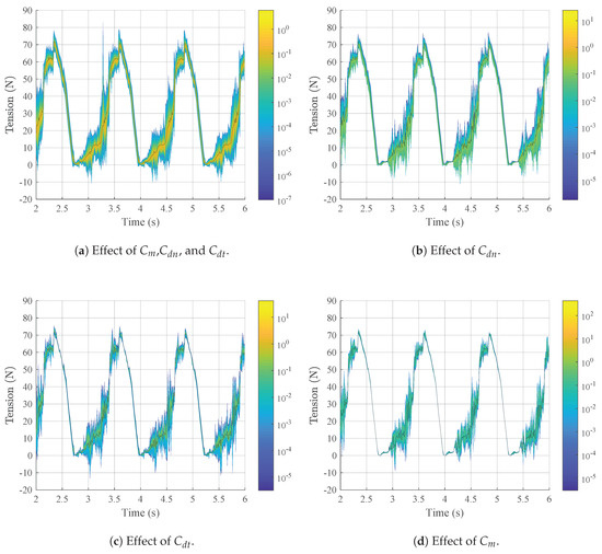 Another way to study the impact of the hydrodynamic coefficients is through variance-based sensitivity analysis, which provides a global sensitivity analysis. A graphical representation of this is illustrated in Figure 8, for the scenario where all the coefficients are varied simultaneously. This figure shows the approximate contribution of each hydrodynamic coefficient to the variance of the tension as a function of time. It is based on the Total Sensitivity Indexes (TSI) suggested by Sobol, computed using the gPC coefficients, as described in [14,42]. In Figure 8, the TSIs are represented by their magnitude relative to each other like in [43], instead of their absolute value. For both rotation periods, Cm and Cdt have the greatest influence when the tension is close to 0 N. Cm has similar contributions in Tr = 1.25 s and in Tm = 3.50 s. For Tm = 1.25 s Cdt dominates in the low tension region, while Cdn dominates during the high tension part of the cycle. For Tm = 3.50 s Cdn dominates almost the entire time, with the exception of very short periods, right before the cable goes slack, when Cm dominates briefly.