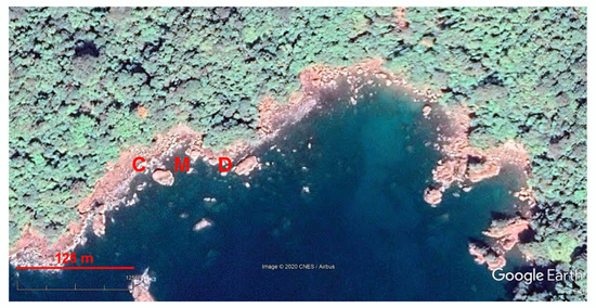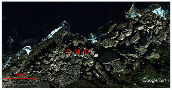 The modern studies of megaclast focus much (even over-emphasize) on their origin and, particularly, their relevance to extreme events such as storms and tsunamis [4,5,6,7,8,9,10,11,12,13,19,20,21,22,23,24,25,26,27]. Evidently, these studies deal with the dynamics of the coastline and megaclasts themselves. The Google Earth Engine gives exceptional opportunity to contribute to such investigations, as a time series of satellite images is available. This means that direct comparison of the views of some areas at different time slices is possible. Three limitations are as follows. First, ‘old’ satellite images are not available for all areas and the date of these images differs for different areas. Second, the resolution of ‘old’ images can be lower than that of the current images. Third, due to a different time of image making, shadows, vegetation, and, importantly, water level may look differently. However, the third problem can be overcome in many cases.