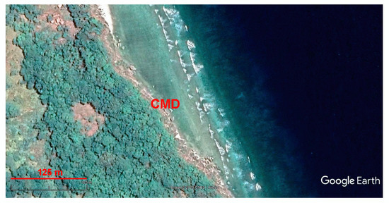 The eastern plot of the Hondarribia locality (the view provided by the Google Earth Engine). CMD labels coastal megaclast deposits (the same is on the following figures).