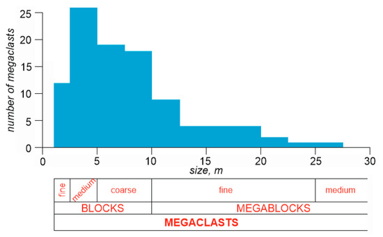 From the four examples considered in this study, the only Hondarribia locality satisfied all four conditions outlined above. To demonstrate the efficacy of satellite image analysis, the western plot of the locality (Figure 3) was considered. The Google Earth Engine provides the option of the measurement of objects directly on a satellite image. The maximum size of 100 megaclasts was measured with this tool on the chosen plot. Apparently, the measured particles constituted about 70% of all megaclasts visible on this plot. The size of megaclasts varied between 1.0 and 26.2 m. The mean size was 7.8 m, and the median size was 6.3 m. These values corresponded to coarse blocks, according to the classification of Bruno and Ruban [16]. The grain-size distribution of megaclasts is shown on a histogram (Figure 10). The majority of particles had the size of 2.5–5 m, i.e., these were medium blocks. However, coarse blocks (5–10 m) and fine megablocks (10–25 m) were the most common. Generally, these coastal boulder deposits included 37% of coarse blocks, 26% of medium blocks, 24% of fine megablocks, 12% of fine blocks, and 1% of medium megablocks, i.e., it was dominated by the particles with the size of 2.5–25 m, which indicates on a restricted sorting. Undoubtedly, this deposit also bore some finer components like boulders, gravels, and even sand, but these were invisible on the satellite image. Anyway, the dominance of the noted megaclasts in these deposits was indisputable.