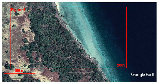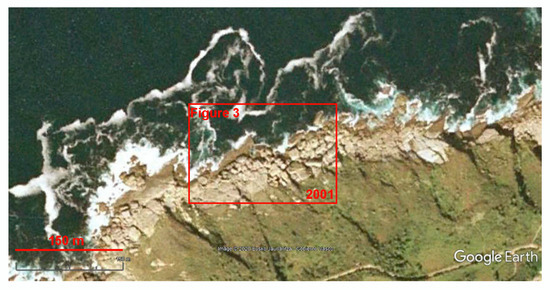 In order to understand the importance of the analysis of the image time series for the understanding of the dynamics of coastal boulder deposits, the new localities identified in the present work were taken as examples. ‘Old’ satellite images (captured 10–20 years ago) of appropriate resolution are available for three of them (Hondarribia, Ponza Island, and Wetar Island—one plot was selected for analysis in each case). However, in the only case of the Ponza Island, the maximum appropriate resolution of the ‘old’ image was the same as that of the ‘new’ image. In two other cases (Hondarribia and Wetar Island), the resolution of the ‘old’ image was lower, but it allowed recognition of the principal features, i.e., megaclasts, via comparison to the higher-resolution ‘new’ image. Megaclasts from the western plot of the Hondarribia locality occupied the same position in 2001 (Figure 11) as in 2018 when the currently available image was captured (Figure 3). Apparently, the number of blocks and megablocks did not change, although some of them had worse visibility on the ‘old’ image because of the higher sea level (apparently, the time of tide). No changes were also found between 2007 (Figure 12) and 2017 (Figure 5) on the northwestern plot of the Ponza Island. Moreover, the ‘old’ image was of better quality in this case. The shadow from a tall cliff did not ‘mask’ a part of the deposits, and the better seawater transparency permitted us to document that up to a quarter of the deposits stretch to the submarine environment. Finally, nothing related to megaclasts changed on the eastern plot of the Wetar Island between 2009 (Figure 13) and 2019 (Figure 6).
