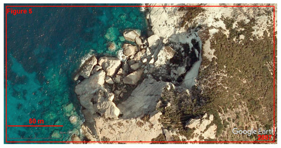 The first opportunity is linked to photos provided by the users (first of all, tourists) of the Google Earth Engine, the geographical attachment of which is displayed directly on satellite images. Megaclasts and their accumulations are notable features, and these can be recognized easily on photos. Moreover, the latter can help in satellite image interpretation, i.e., for the correct description of the particle shape and package density, as well as for the distinction between true megaclasts, semi-detached megaclasts, and parent rock exposures; the content of boulders and finer components of deposits can be also registered. In the present study, the photos provided by the Google Earth Engine were helpful in the cases of the Hondarribia and Ponza Island localities. However, the number of the proper photos was limited for some remote, infrequently visited places, or these were not available at all.