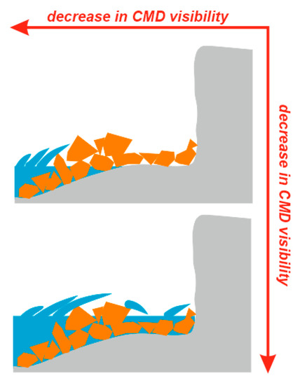 First of all, the main differences of coastal megaclast deposits from sandy beaches should be noted. These deposits are more localized and often narrow; these rarely form lengthy ‘belts’ like sandy beaches. The latter are often distinguished on satellite images by a white or yellow color, whereas coastal megaclast deposits may look very differently in each case. Importantly, these deposits are often not continuous particle packages, but individual stones or stone groups dispersed along the coastline (this is especially well visible at the Weater Island locality—Figure 6 and Figure 7). To make a clear distinction between true megaclasts and semi-detached megaclasts or rock exposures is not always easy, especially when the surface of a given area is not flat. When sandy beaches are detected, the objects of study are beaches themselves, and the researchers do not to pay attention to sand particles that cannot be determined from the space. In contract, studies of coastal megaclast deposits require attention to giant particles. That is why such studies depend stronger on image resolution. The experience with the Ponza Island (Figure 5 and Figure 12) implies water transparency influences on the detection of megaclasts that are fully or partly drowned, whereas the evidence from the Hondarribia locality (Figure 3 and Figure 11) indicates on the importance of the sea level, i.e., tides. As a result, visibility of coastal megaclast deposits decreases under certain conditions (Figure 14).