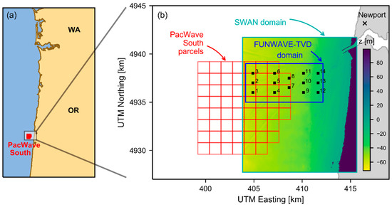 (a) Location map and (b) detailed view of the study site. PacWave South parcels are shown in red in the inset. SWAN and FUNWAVE model domain extents are shown in cyan and blue, respectively, with a colormap of bathymetry distribution. The layout of the virtual WEC array is represented by the black squares.