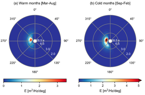 PWS spectra during (a) warm (March through August) and (b) cold (September through February) months averaged from January 1979 to December 2010.