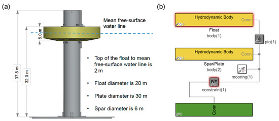 Each hypothetical WEC is modeled in WEC-Sim as a two-body floating-point absorber (FPA). This WEC device was developed as part of the U.S. Department of Energy’s Reference Model Project [41]. The FPA model, as shown in Figure 4a, consists of a float and a spar/plate that are connected to a central column, and it transforms energy from the relative motion in the axial direction between these components induced by ocean waves. Additional specifications for the full-scale WEC device are presented in Table 2. The masses of the float and spar/plate are located at their equilibrium positions in which each body mass equates to its mass of displaced water. Figure 4b illustrates the two-body FPA in the WEC-Sim model and block modules for calculating the wave radiation, excitation, net buoyancy restoring, viscous damping, and PTO force. More details about the model settings and validation of the hydrodynamic response are described in [42].
