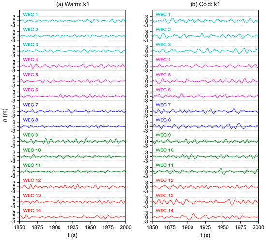 Sample time series of sea-surface elevation at all virtual WEC stations, color-grouped by distance from shore. (a) Warm months, first realization, and (b) cold months, first realization.