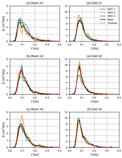 Spectra derived from FUNWAVE time series at select WEC locations, corresponding to all three realizations of (a–c) warm months and (d–f) cold months. The mean spectra of WECs 1–3 are also shown in each panel, as well as the hindcast spectra for each climate.