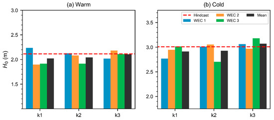 Significant wave height values computed from FUNWAVE post-processed spectra for the case of (a) warm weather and (b) cold weather months, compared to hindcast benchmarks.