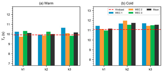 Energy period values computed from FUNWAVE post-processed spectra for the case of (a) warm weather and (b) cold weather months, compared to hindcast benchmarks.