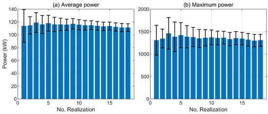 Uncertainty in simulation results due to the number of wave spectrum realizations for (a) maximum and (b) average power. Black error bars indicate the 95% confidence interval.