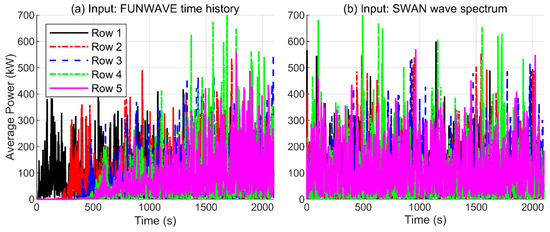 Figure 10 shows time series of average power calculated with WEC-Sim using FUNWAVE time series of sea-surface elevation and SWAN spectra. Each colored line represents the average power of a row of WECs each at an equal distance from the offshore boundary (as shown in Figure 3; e.g., row 1 includes WECs 1–3, row 2 includes WECs 4–6, and so on). As mentioned in Section 3.1., waves modeled with FUNWAVE take approximately 600 s to travel from the wavemaker to the shoreline boundary. Because of this transient effect, we observe a similar behavior in the time-history of average power for every device in the WEC farm modeled with FUNWAVE time series (Figure 10a). In contrast, the wave power computed with SWAN wave spectra is fully captured at the beginning of the simulation, as shown in Figure 10b (the same can be observed in power time-histories of runs using FUNWAVE spectra as input [not shown]). Because of this, we remove the first 700 s of all recorded power time series to compute quantities of interest (i.e., average power and peak-average power).