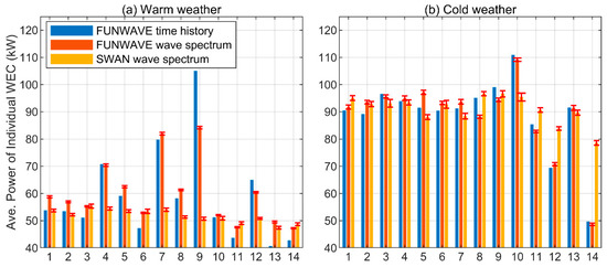 Average power of individual devices in the WEC farm under (a) warm and (b) cold weather conditions. The column bars are colored by the type of input used in the WEC-Sim simulations. The red error bars indicate the 95% CIs.