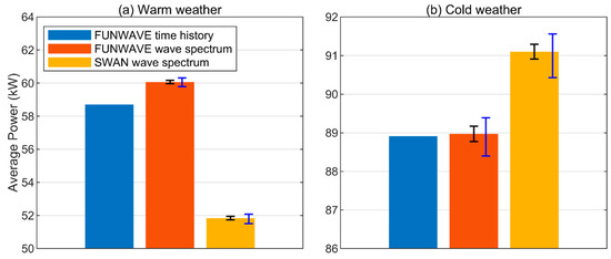 The average power of the WEC farm including all 14 devices in (a) warm weather and (b) cold weather months. The column bars are colored by the type of input used in the WEC-Sim simulations. Black error bar: 95% CI; blue error bar: minimum to maximum value range.