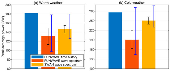 The peak-average power of the WEC farm including all 14 WECs in (a) warm weather and (b) cold weather months. The column bars are colored by the type of input used in the WEC-Sim simulations. Black error bar: 95% CI; blue error bar: minimum to maximum value range.