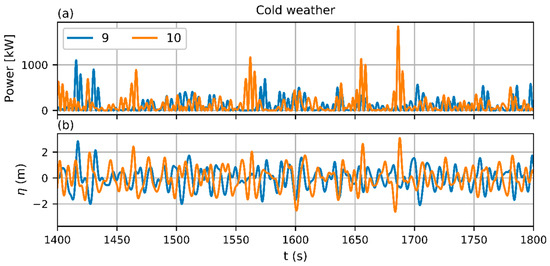 (a) Power production and (b) water surface elevation at WEC stations 9 and 10 for the third realization (k3) of the cold weather case.