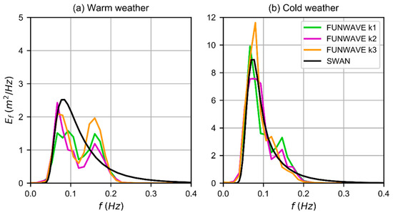 Comparison of FUNWAVE (k1, k2, k3) and SWAN wave spectra corresponding to WEC 13 for the case of (a) warm and (b) cold wave climates.