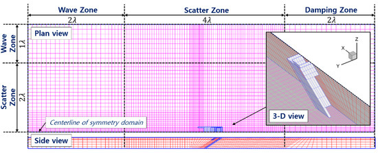 The computational mesh of the three-dimensional numerical wave tank including an inclined OWC chamber is shown in Figure 3. The depth of the entire fluid domain is assumed as constant, and each numerical region length is set to be proportional to the wavelength (). For computational efficiency, the symmetric flow domain was considered at the centerline of the OWC chamber.