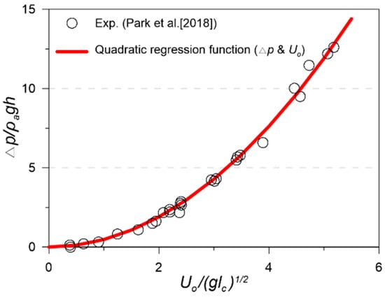 The differential pressure and airflow speed measured at the orifice of the experimental model are shown in Figure 5. The pressure drop inside the chamber has a nonlinear relation with the airflow speed. A previous study [] also noted that the pressure versus airflow rate is roughly quadratic in most self-rectifying turbines, including impulse types. The quadratic regression function (red line in Figure 5) was derived to define the nonlinear empirical relation by using a least-square method for both experimental pneumatic responses, where the nonlinear pressure drop coefficient () is 1.576. In order to account for the turbine–chamber interaction in the present numerical model, the pneumatic characteristic of the turbine was numerically modeled to an orifice with the nonlinear empirical relation of pneumatic responses as a quadratic function.