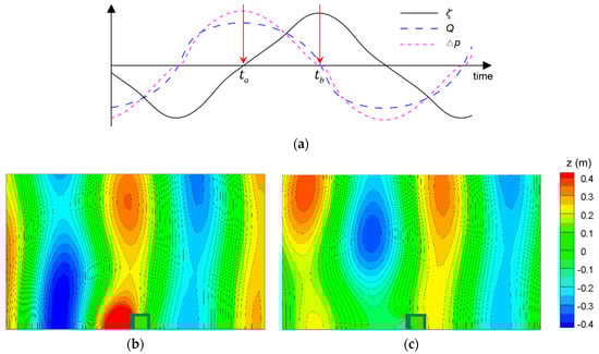 Figure 6b,c show the wave fields around the OWC chamber at time and , respectively. When the pneumatic response is peaked (), a crest of a standing wave is formed in front of the chamber, shown in Figure 6b. However, when the surface elevation inside the chamber is a peak (), the wave elevation (z) in front of the chamber decreases, as shown in Figure 6c. It can be said that the pneumatic response was in phase with the surface elevation in front of the chamber.
