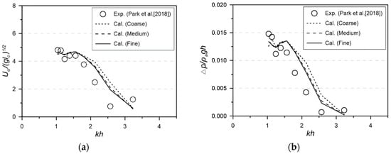 The validity of the present numerical model was examined by comparing it with the results of the model test, shown in Figure 7. Here, the airflow speed and the pressure difference (drop) are directly compared between the present calculations and the experimental data. The numerical results are suggested with three different mesh resolutions to show their convergence. It can be observed that overall trends of the present calculations are quite similar to those of the experiments. However, some discrepancies are seen, especially in the short-wavelength range (large kh value), where the numerical results slightly underestimate both airflow speed and pressure difference, unlike the experimental data. This is because, under short-wavelength conditions, the free-surface inside the chamber shows nonlinear behavior with a complex sloshing motion which cannot be considered in present potential calculations. In addition, it is understood that the turbulent flow around the skirt structure causes additional dissipation regarding the dynamics of the oscillating water column.
