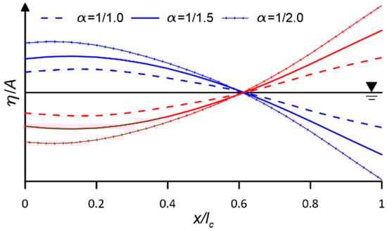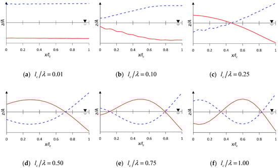Figure 8 shows the free-surface profiles of the water column with various wavelength conditions. The dashed lines indicate the surface profiles corresponding to the crest, while the solid lines indicate the trough of the water column at the time () in Figure 6a. The solid black line corresponds to the mean sea level. If the incident wavelength is long enough compared to the chamber length (), the free-surface profiles become almost flat, which means a piston-type water column motion is dominant in the OWC chamber. The sloshing-mode motion occurs under the condition of , where the surface motion becomes symmetric with respect to the wave direction. The response characteristic of the OWC seems to be affected by the length of the standing wave (), which is half of the incident wavelength (). The surface of the water column becomes a more complex shape (i.e., higher-order mode shape). It also categorized the surface motion of the water column inside the chamber into two types: piston-type and sloshing motion [].