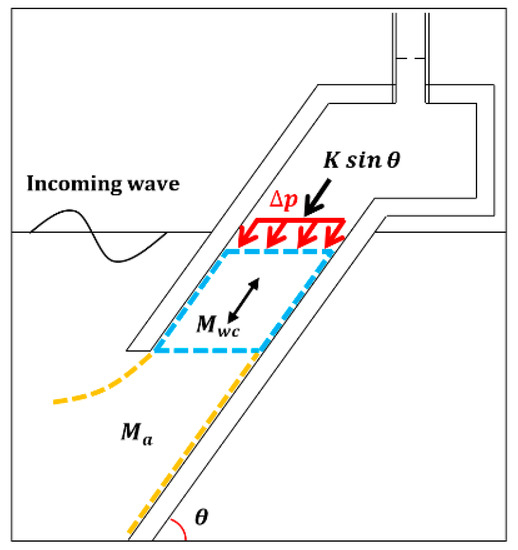 The piston-type motion of the water column can be idealized to a single-degree-of-freedom (SDOF) system, as shown in Figure 9. The natural frequency of the SDOF motion can be calculated, taking into account the mass and restoring force of the system. The effective water mass for the OWC’s piston motion can be defined as , where is the mass of the water column inside the chamber. is the added mass that behaves together around the chamber when the water column oscillates, which affects the hydrodynamic characteristics of the water column. The natural frequency of the OWC’s piston motion () can be calculated based on the effective fluid mass of the water column () and the restoring force () due to gravity in Equation (15). The added mass acting on the water column depends on the shape of the chamber with incident wavelength. The inclination of the chamber () is related to the oscillatory direction of the piston motion, which affects the direction of the restoring force acting on the water column. Moreover, the pressure drop inside the chamber acts as a damping force on the oscillating water column.