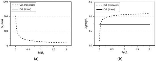 Nonlinearity of pneumatic responses for wave height in regular wave simulation. (a) Airflow speed; (b) pressure drop.